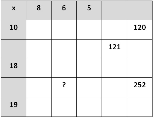 The diagram shows an incomplete multiplication table.What number should be in the place of the “?”?Enter your answer:Answer: