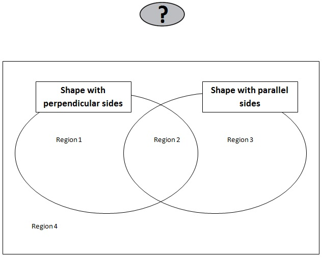 The Venn diagram is used for sorting shapes.Which region would the shape shown go in?Choose your answer:A2B1CNone of the regionsD3E4