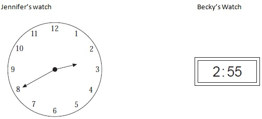The time on Jennifer’s analogue watch and Becky’s digital watch is shown below.